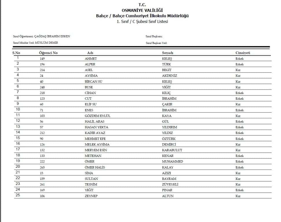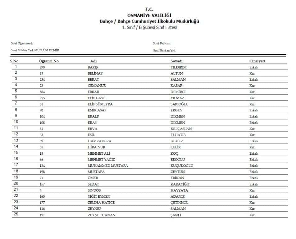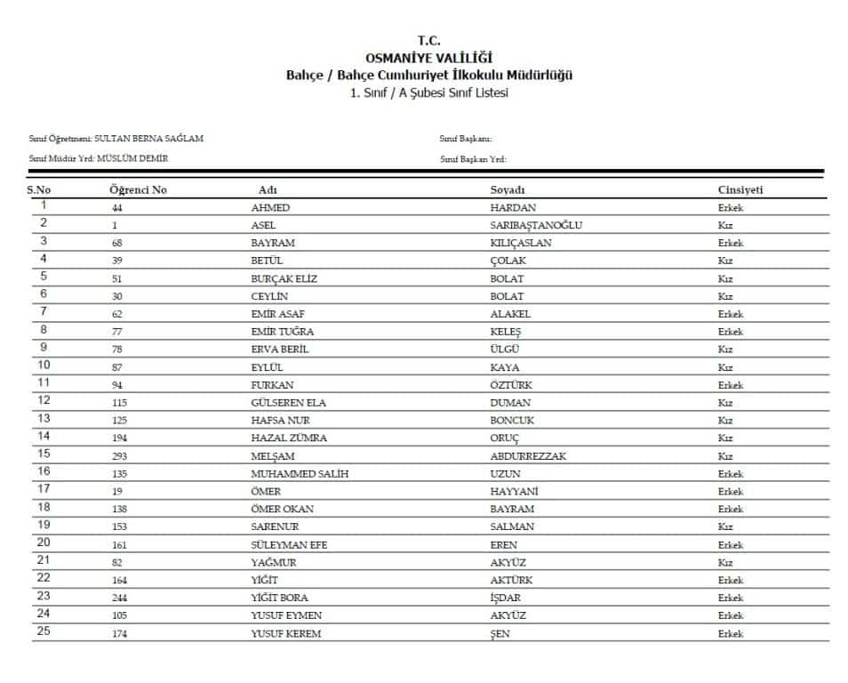2025-2026 Eğitim ve Öğretim Yılı 1. Sınıf Kura Sonuçları